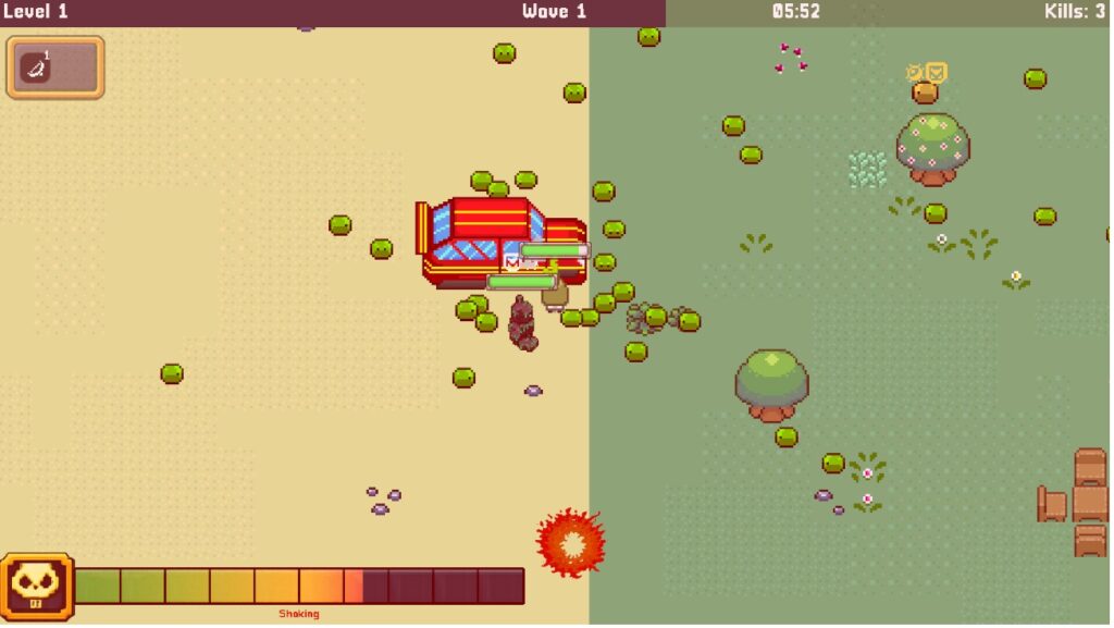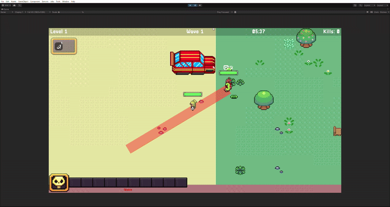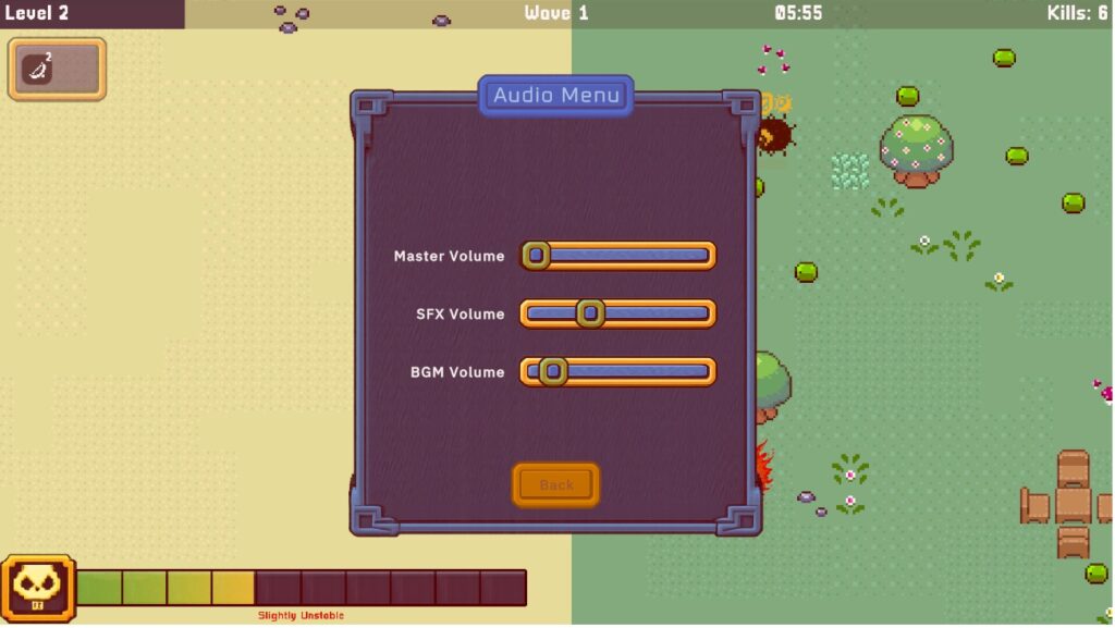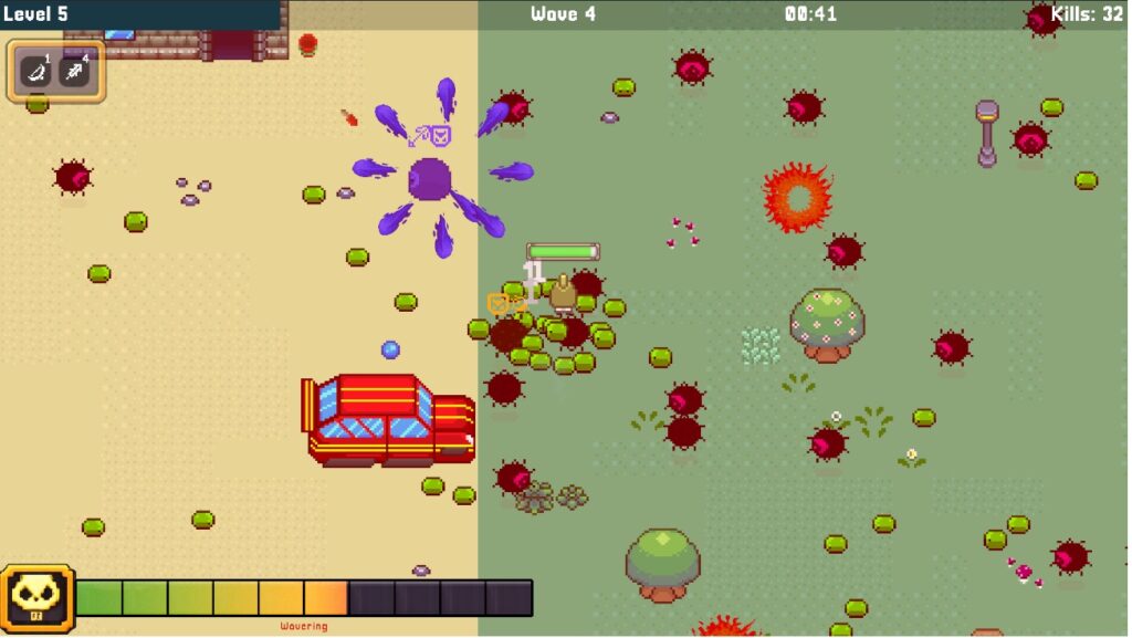 - Dynamic HUD for HP, XP, instability, and time survived
