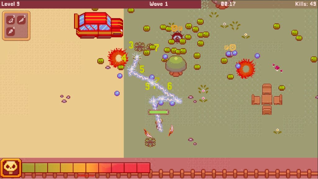 - Choose upgrades that improve weapons and player stats