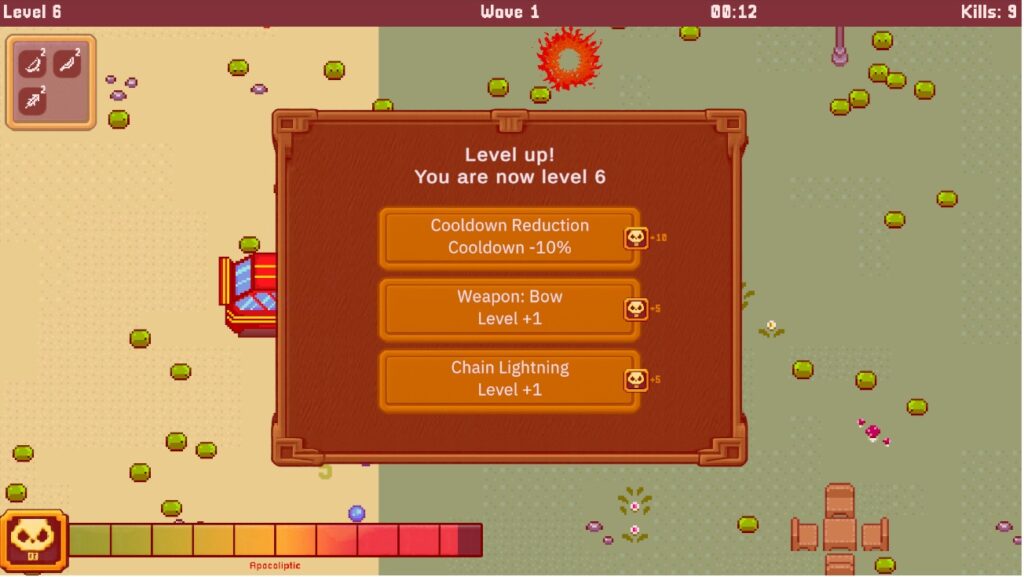- Level-ups pause the game and present randomized upgrade choices