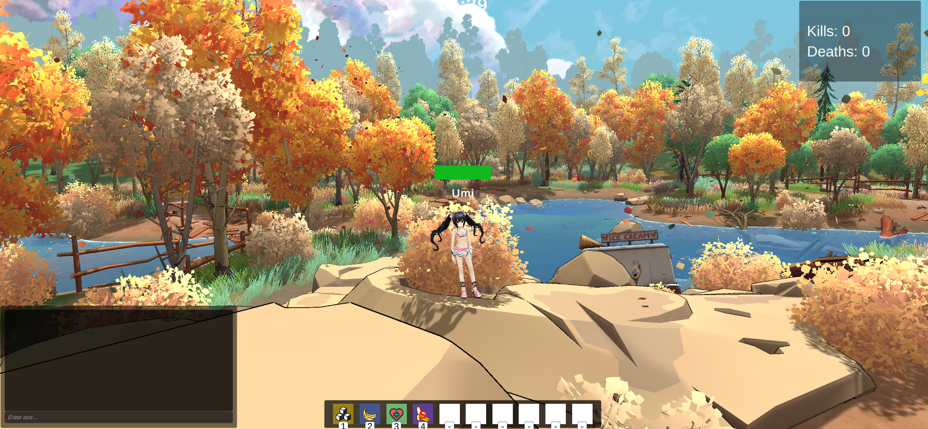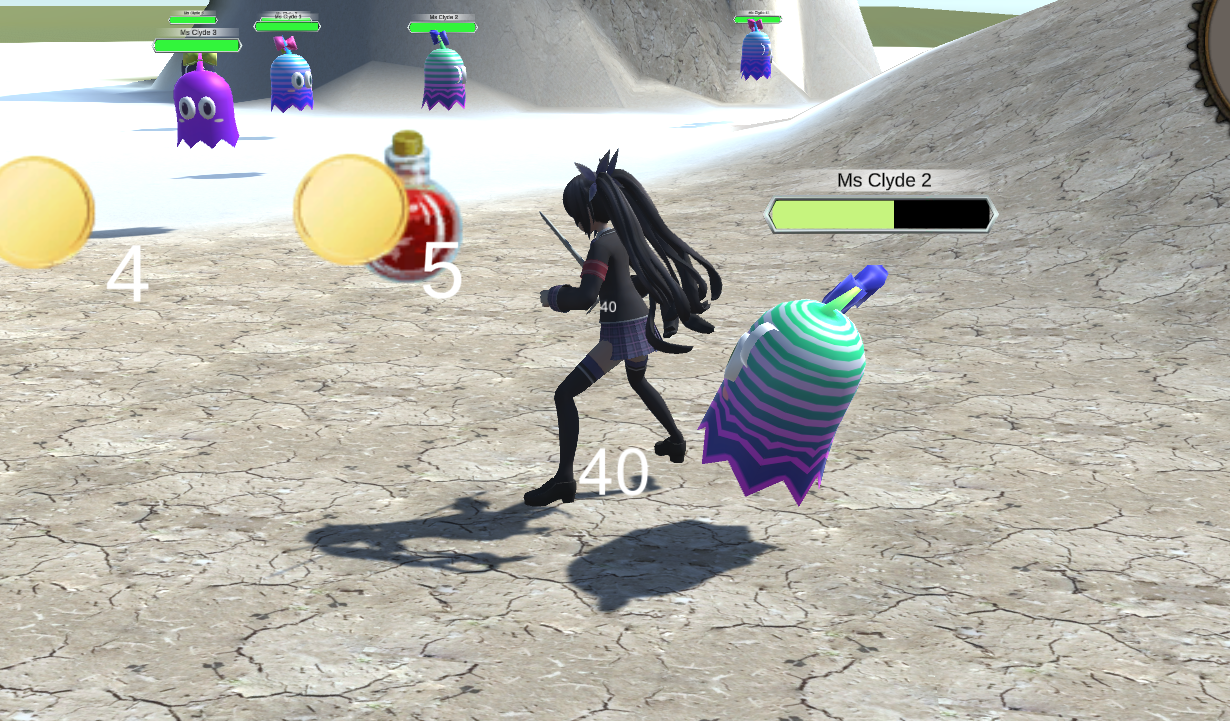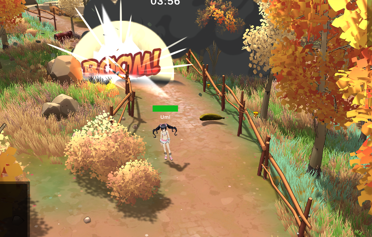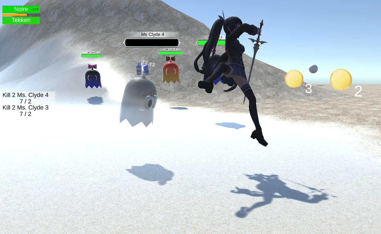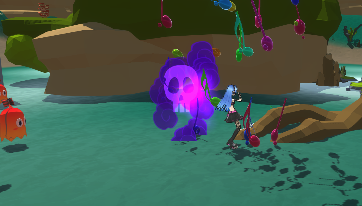 The character can use attacks spawning notes and her ultimate ability is a dance which spawns a lot of notes, chasing enemies and exploding on impact: